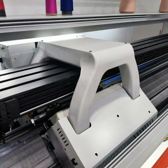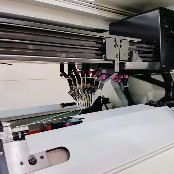 | Buse de fil | Le système peut ajuster la position d'arrêt de la buse de fil pendant le tricotage sur la machine. Grâce à cette fonction, la buse de fil peut suivre de près les deux côtés du tissu à tout moment, sans nécessiter d'ajustements complexes. Sur la base de cette caractéristique, on peut économiser beaucoup de temps dans l'ajustement des paramètres de conception de la machine, en particulier pour des conceptions complexes. Le système permet de broder plusieurs buses de fil sur une même ligne et peut facilement gérer des conceptions complexes telles que l’appliqué ou les motifs "knit & wear", ce qui améliore considérablement l'efficacité de production. | |||